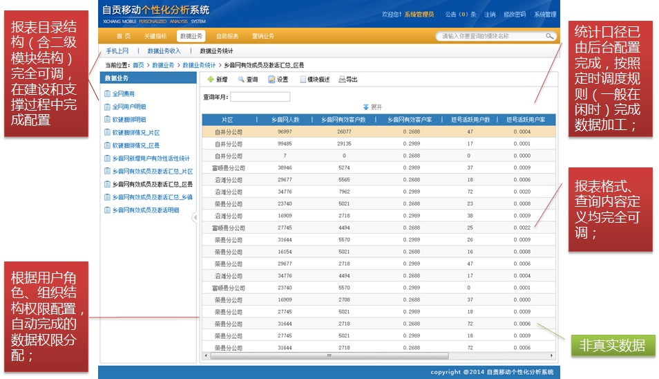 市场、集客、数据、财务等,所有需要大市场业务数据支撑的业务部门;区县分公司,一直延伸到一线包括片区、网格等层级;所有常态化、或阶段性营销活动等报表均可以在系统中实现,包括各类日报、周报、月报等;